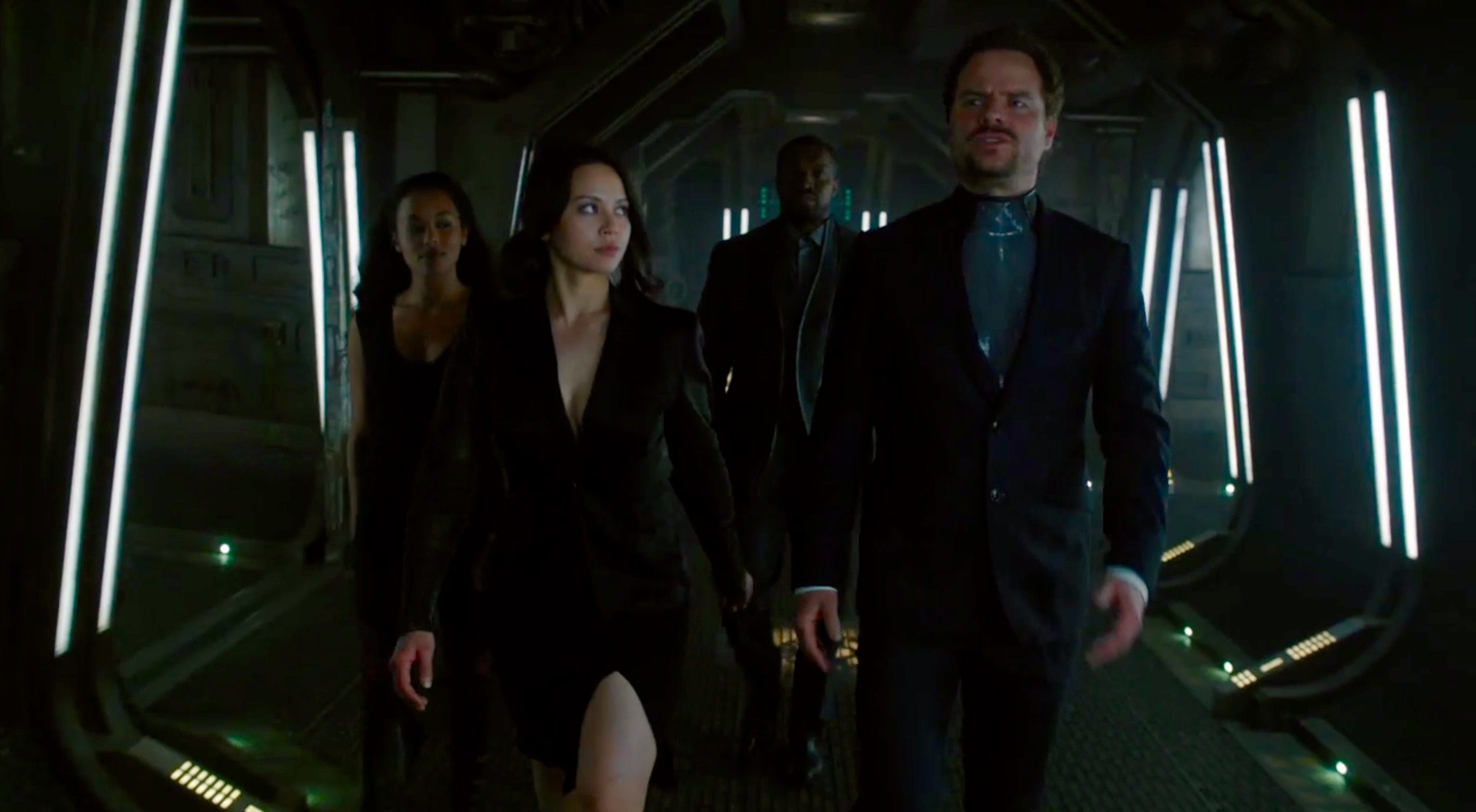Oh yeah. Today’s Dark Matter season 2 sneak peek screen shot shows certain members of the crew all dressed up and heading out. What’s the special occasion? Well, I can’t be certain, but I suspect it’s the Dark Matter season 2 premiere, airing this Friday night at 10 pm (after Killjoys!) on Syfy and Space Channel!