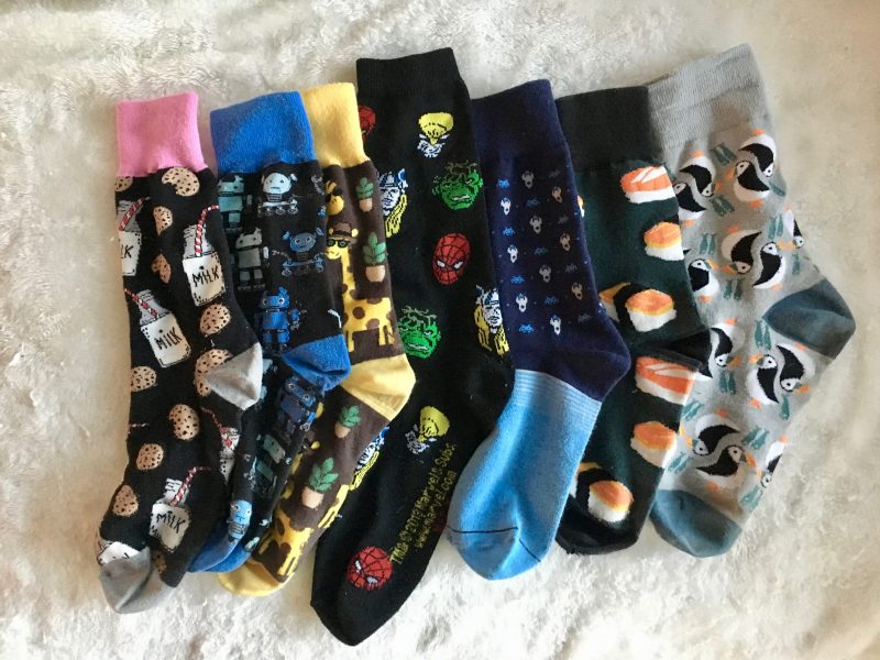 Here are the runners-up that didn’t make the cut. All great socks, but it was a tough competition — From left to right: Milk & Cookies, Robots, Cool Giraffes, Space Invaders, Marvel Heroes, Sushi, and Puffins.