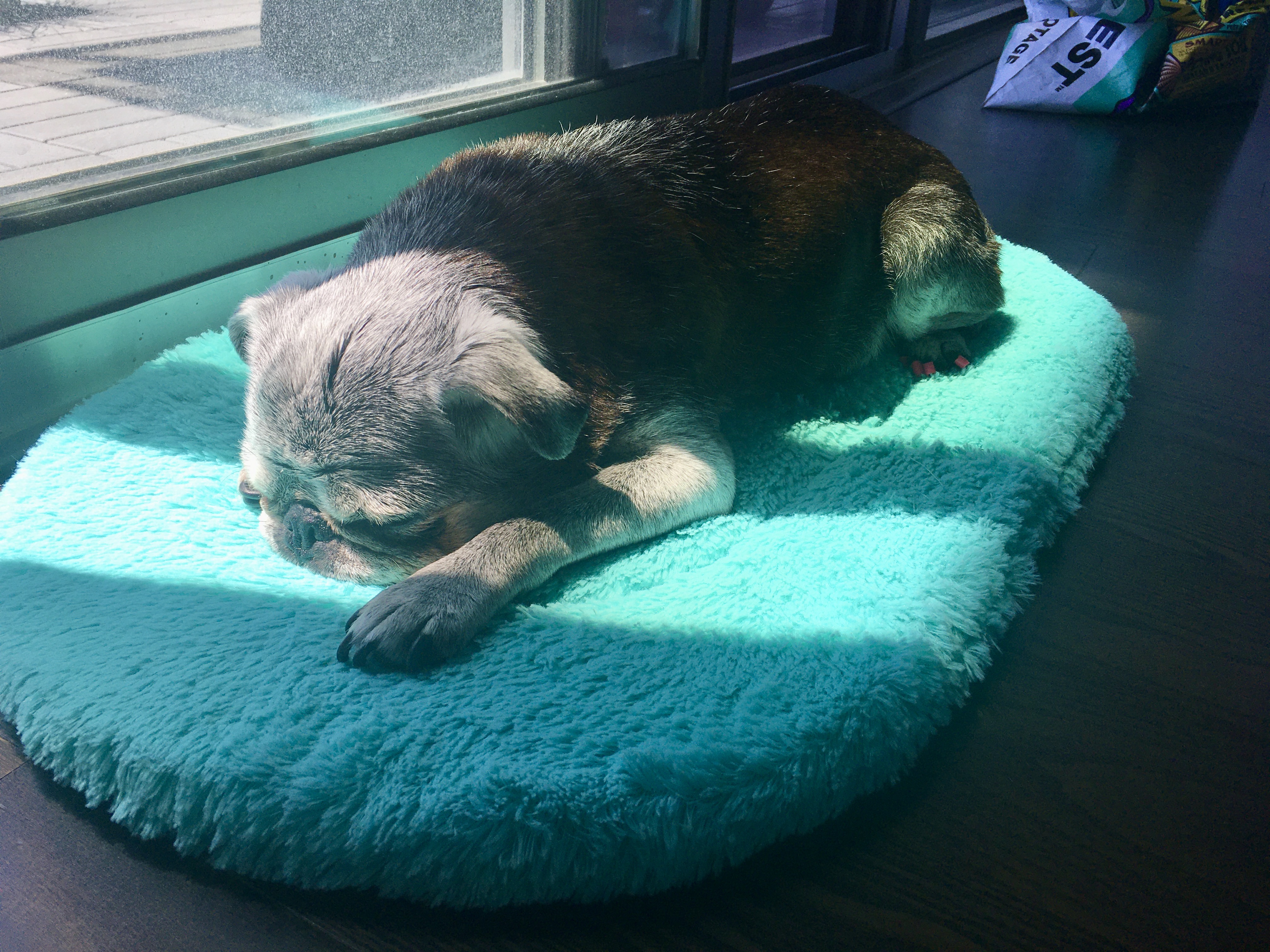 After her morning walk, she is so tired that crawling fully onto a bed is too much of an effort. So…close enough!